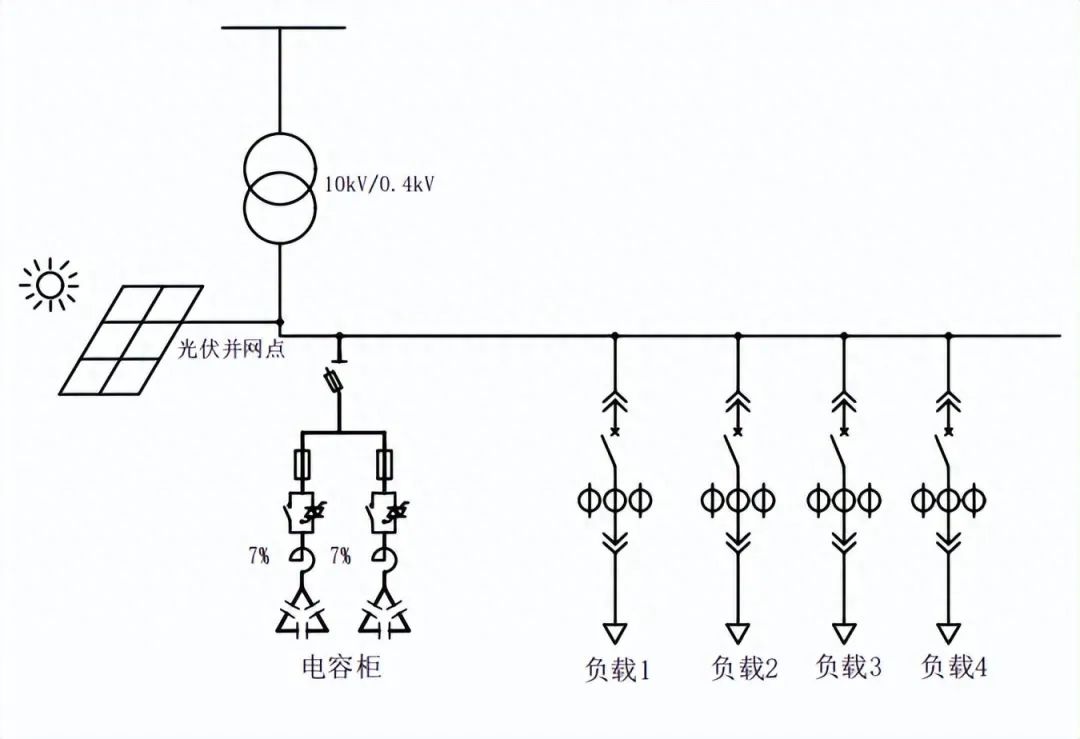 光伏接入點(通常在低壓側負荷附近)如同在用戶內部系統中加入了一個新的“電源”。它主要輸出有功功率(默認單位功率因數運行,無功Q≈0)。